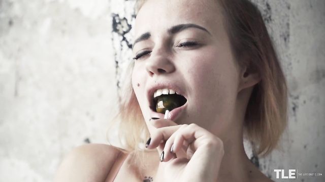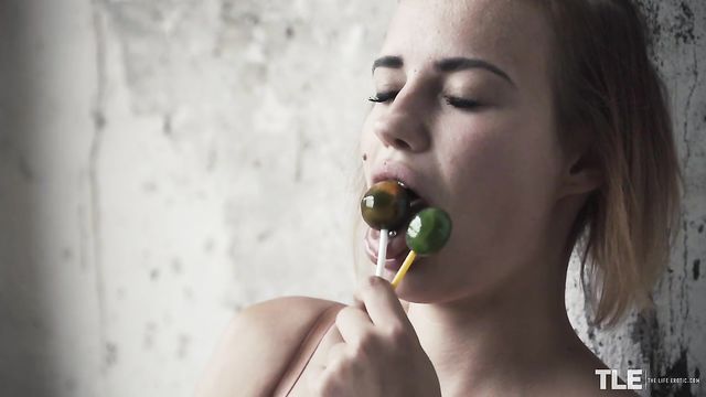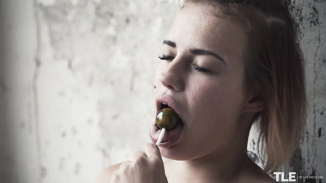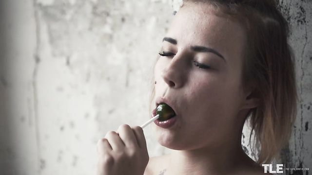 Description:Hot Angelina A – a sassy tattooed babe from Belarus, with a blonde-tipped brunette bob and a beauty mark on one cheek – is taking a barefoot walk outdoors. Dressed in just a revealing pink babydoll top and high-cut white lace panties, she’s carrying a duffel bag and sucking on a couple lollipops. She wanders through the long grass and weeds near some derelict buildings, then takes a break in the shelter of a large, arched concrete tunnel. Sitting splay-legged on her bag on the dirt floor, she enjoys her sweet treat and begins to rub her pussy through her underwear. She soon pulls the crotch aside to reveal a shaved pussy and starts to masturbate with manicured fingers, still sucking on a lollipop. She peels off her panties and continues to pleasure herself, a look of ecstasy on her face as she swirls her pierced tongue around the sweet, hard candy and spins it against her full lips. Moaning rhythmically, she rubs her clit and slides two fingers inside. Next, she runs one of the drool-wet lollipops down the front of her body and circles it over her fleshy pink slit, before slipping it in her snatch. She pumps and grinds the jewel-green candy inside of her, while sucking on the other. She raises her ass clear of the ground, rocking and squatting on her tiptoes, smearing her entire slit with pussy juices as the camera homes in for a close-up. She reaches behind each thigh to vary the angle, then brings the second lollipop down to tease her clit as she screws her snatch with the first. Her cries become louder and more urgent until, at last, she cums, letting one lollipop fall into the dirt as she relaxes and caresses her curves…