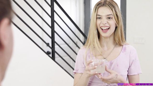 Description:Molly Little and her friend Khloe Kapri discuss everything. Today, they're in Molly's bedroom chatting about how much they like it when guys blow their load across various distances. Longer is obviously better. Molly's stepbrother, Jay Romero, walks in at just the wrong time to hear the girls talking about five feet. He mistakes that they want a dick that's five feet long, which just makes the girls ridicule him.Later, Khloe and Molly decide to play with Jay. They approach him with a cup of lemonade and tell Jay that if he can shoot his load five feet to hit the glass then Molly will let him fuck her. Jay agrees, so Khloe gets on her knees to measure out five feet and then jerk Jay off. He hits the mark all over Molly's face. True to her word, Molly joins Khloe sucking Jay's cock and balls. Hopping onto the couch, Molly peels her clothes off and spreads her thighs for Jay to sink into that hot little pussy.Khloe isn't satisfied just watching the show. She wants some of the D for herself and Molly is happy to share. Getting on her hands and knees, Khloe takes it in doggy as she eats Molly out. Then Jay takes a seat so Khloe can ride the fuck stick in reverse cowgirl. Molly wants to get some doggy style action, so she gets on her hands and knees to mirror Khloe's spot in the middle. That's enough to bring Jay to the edge. The girls get Jay off for the second time that afternoon, this time with another handie until he gives it to them in a facial that leaves both girls sticky but sated.