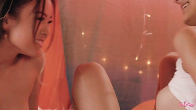 Description:Ensconced in their blanket fort, Eliza Ibarra tries tossing a popcorn kernel into her bestie Lulu Chu's mouth, but it's harder than it looks! These babes don't have any luck catching the snacks, but Eliza feeds some popcorn to Lulu, who starts feeling some unexpected butterflies for her BFF! Lulu tells Eliza to close her eyes, and kisses her. Soon these gorgeous girls are making out and sucking each other's breasts. Lulu gets her first taste of her bestie's pussy, and then Eliza takes her turn licking Lulu! It turns out these friends have been crushing on each other for a while, and they make up for lost time with their eager scissoring and 69ing!