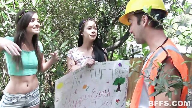 Description:Gia and her friends are all about saving the Earth, going green and all that - so Earth Day is a BIG thing for them! Gia was really bummed to find out that her parents wanted to cut down a tree that they planted when they first moved into the house - a tree that she grew up with! Gia and her friends werent having that and when the guy got there to cut down the tree these friends banded together to stop that from happening! What they didnt expect was for the guy to be so attractive - so when talking to him didnt work Gia turned to something else. They flashed him their boobs and had him squeeze their supple plump tits before dropping to their knees and slowly unbuttoning his pants. Gia and her friend took turns with the cock in their mouths - passing it off to each other and smiling with each lick. Then these girls propped themselves up on the very tree that was getting chopped down and instead got plowed from behind by his other tool! After helping each other get fucked in various positions the woodsman finally spilt his seed all over Gias stomach and tits while her friends watched. Guess what? All their hard work paid off and the tree did not get chopped down this day!