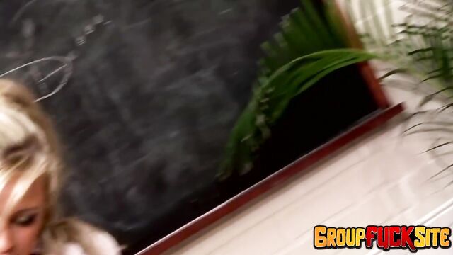 Description:What starts off, as all girl orgy, is set up, with stunning, tiny titted, svelte, blonde Anna Lovato, playing a sex ed instructor, for four horny, loquacious, lewd, and lascivious school girls, played by ravishing, big titted blonde trollops, Caprice Jane and Natasha Marley, along with bewitching, brunette Gemma Massey, and alluring, big boobed, blonde Michelle Thorne, who is really a MILF, but can still pass, for a sexy, school girl. Thanks to a more pervasive, British curriculum, the class promotes a more promiscuous take, on sex ed, endorsing a hands and tongues on approach, coupled with ample use of dildos, as teaching aides. Putting what they have learned, into practice, the girls frantically kiss, fondle, lick, finger, and dildo fuck one another, in a breathtaking, sizzling hot, moaning, wailing, lubricious Lezfest. When an errant male teacher wanders into the class, his shock, is soon replaced, with impassioned ardor, as he pairs off with Michelle, fluidly moving from pussy licking, cock sucking, and 69, to some ardent pussy pounding, in missionary, until she finally gets an A+, in sucking him off, to a glorious orgasm, that fills her mouth, with a massive load of cum, while the girls cheer her on. They all get graduate Magna Cum Laude.