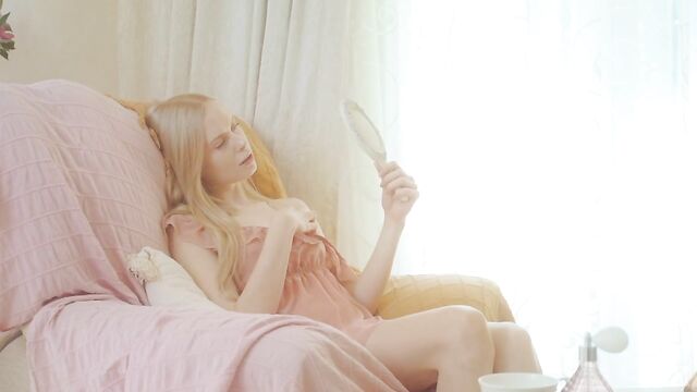 Description:Sensual sweetheart Maria Rubio wakes and sips morning tea in her boudoir. Dressed in a pink nightdress that complements her ivory pale skin and her long blonde hair, the Russian princess is a picture of ethereal beauty. She sprays an exotic fragrance on her neck, and slips the nightdress down off one of her slender shoulders to expose a single breast, which she gazes at in a hand-held mirror. She pulls back her panties and studies her shaved pussy in the mirror too, and continues to do so once she’s naked and finger strumming her slit and clit. It’s the start of a solo sex session that culminates in an intense orgasm.