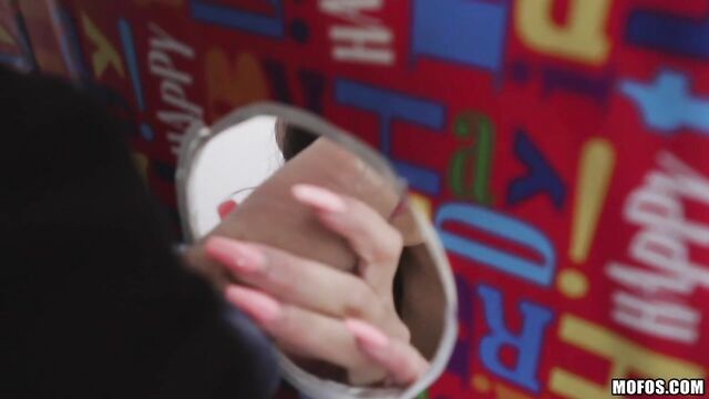 Description:When Vienna Black does a birthday, she does it dirty! Her man comes home to find a life-sized giftbox with a gloryhole, and after a deepthroat BJ, the ebony spinner presents his real gift: her tight asshole for their first anal sex!