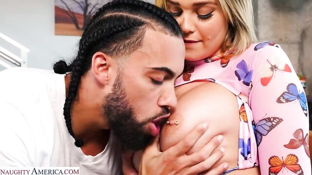 Description:Kali Roses is over ready for a beach day with her friend, but she seems to be at work. Kali's friend's boyfriend, James, is the only one home. Lucky for him he gets to be the first to see her nice and big new pair of tits that she was so excited to show off at the beach. Once she pulls them out in all their glory, he can't resist but to suck and squeeze them until he blows his load all over them.