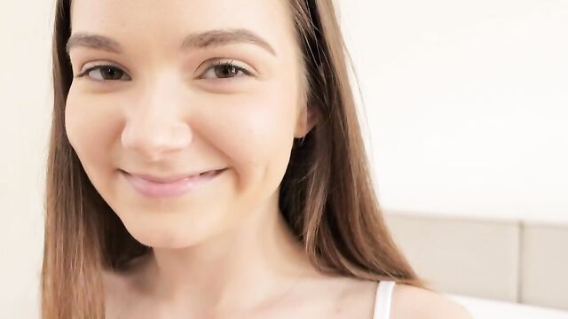 Description:Simona came to the audition wearing her pajamas, which was a very odd choice. She looked ready for a sleepover than a fitness tryout, but luckily we had fitness clothes for her to wear. That frumpy outfit was hiding a young, squeezeable and pliable body, especially after showing off her flexibility. Her cute face turned naughty instantly after I ran my hands along her thighs, around her ass, and onto her breasts. She whispered she wanted to fuck, and got on the bed to spread her legs, opening up that tight pink pussy.