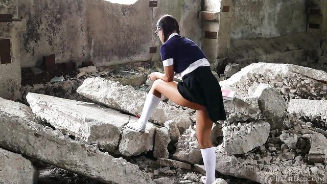 Description:Hot brunette Lola Ash is walking home along a dusty backroad, carrying her college books. She’s rocking a cute and sassy preppy look, in a black pleated skirt, white frilled blouse, cropped blue cardigan, white knee-socks and white sneakers with red laces. She is also wearing glasses and her hair is braided into tight pigtails – however, glimpses of her alternative hipster style, including tattoos and septum and labret piercings, are visible. She approaches a derelict building, possibly an old factory, and decides to investigate. The doors and windows are gone, so it’s just walls and a roof, the floors strewn with rubble. As she cautiously makes her way inside, she pulls a small riding crop out her waistband and taps it against her thigh, hitching up her skirt to flash her white polka-dot panties. Next, she walks over to a pile of rubble – large slabs of concrete from collapsed walls – and rests one foot on it, exposing a tan thigh. She teases herself with the whip, pulls her panties high into her crack and kneads and spanks her own rounded ass-cheeks. One hand slips between her thighs to rub her pussy through her panty-crotch and she humps and lunges against it. She lies down on a flat concrete slab, flips up her skirt and splays her legs wide, using fingers and the whip handle to masturbate through her panties, the cotton clinging to the contours of her pussy lips. She pulls the crotch aside to reveal her shaved, fleshy snatch with a little trimmed landing strip on her mound – then her manicured fingers get to work in her moist slit. As her pleasure increases, she whips her inner thighs hard enough to leave pink welts. This provokes moans then cries of pleasure and she peels off her underwear. Getting on all fours with her firm ass in the air, she hand-spanks her cheeks again, then fingers herself. She sucks on the whip handle like a cock then uses it as a dildo, grinding it against her slit then pumping and stirring it inside of her pussy. As she approaches orgasm, she lies on her back, bucking her ass up off of the rough concrete, then moaning as she cums hard, whipping her thighs to maximize the sensation. As she drifts back down to earth, she caresses herself more gently. Then, suddenly self-conscious, she glances around and dusts herself down. Before she leaves, she puts her panties back on, then continues on her way.