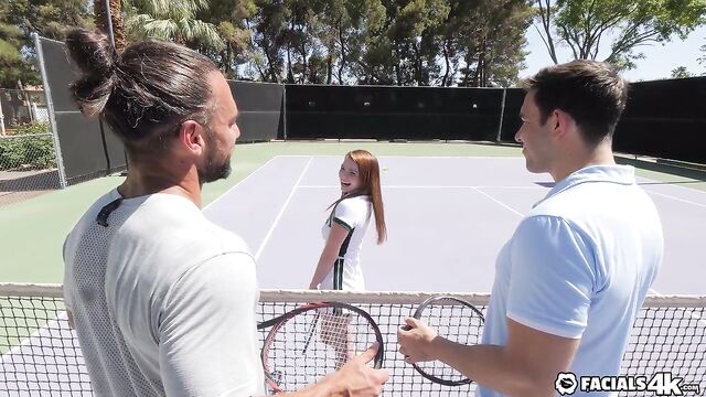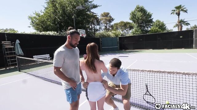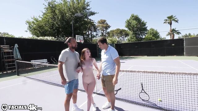 Mazy meets two guys on the tennis courts and leads them inside for threesome. She takes both their loads all over her face.